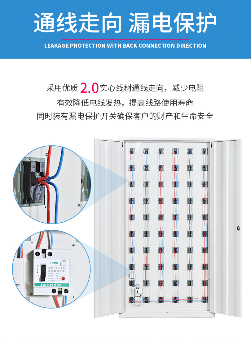 充電柜配備:2.5mm2實(shí)心線(xiàn)材,漏電保護(hù)器,小門(mén)內(nèi)配86型五孔插座(插座可選裝五孔+usb插座、多功能插座)