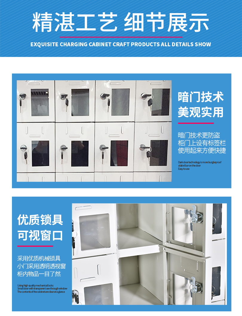 小門(mén)設(shè)計(jì)單獨(dú)鎖具,單柜單開(kāi),可實(shí)現(xiàn)一人一鎖;上方設(shè)計(jì)標(biāo)簽卡槽,便于粘貼姓名銘牌等信息,方便識(shí)別與管理,右下部設(shè)計(jì)透明亞克力觀察窗,便于觀察手機(jī)存放情況;內(nèi)部采用暗門(mén)折邊設(shè)計(jì),有效防止刮手。
